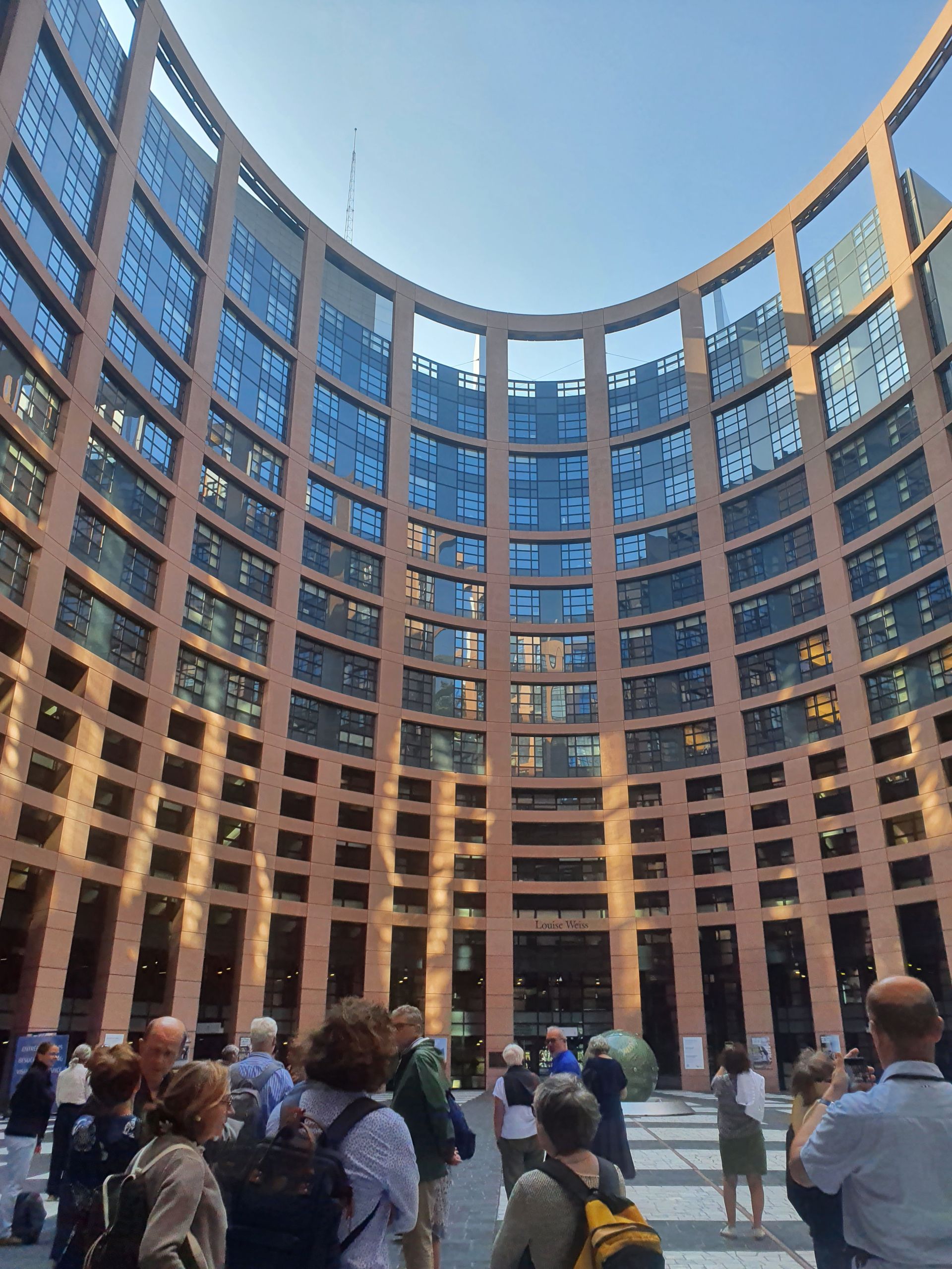 Nous logions à quelques centaines de mètres du Parlement européen que nous avons rejoint à pied. Avant d’entrer dans l’espace Louise Weiss, il a fallu montrer patte blanche ! Nos documents d’identité ont été scannés, nos sacs inspectés. Une fois arrivés dans l’ellipse centrale, nous avons admiré l’architecture de pierres roses, l’axe qui mène à l’entrée, la flèche de granit qui indique la cathédrale et aussi la « Terre unie », globe de verre installé par les deux artistes polonais Beata et Tomasz Urbanowicz.